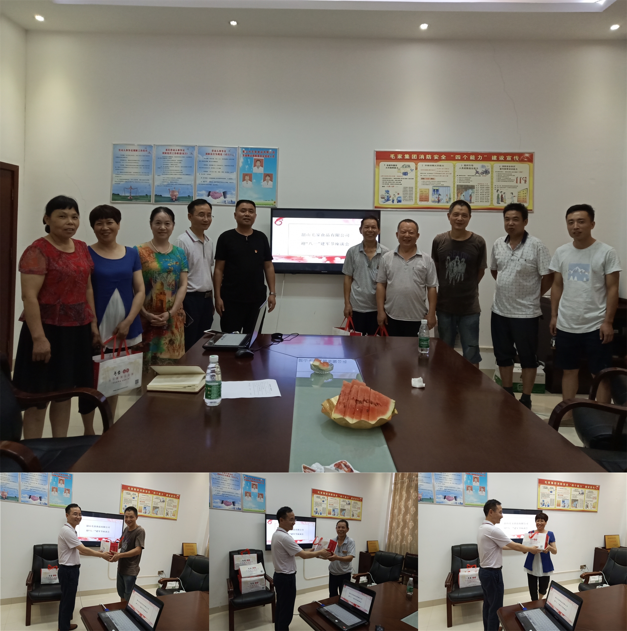 (2018年7月31日,毛家食品召開(kāi)迎“八一”座談會(huì),為退役軍人、軍屬及烈屬送上慰問(wèn)品)