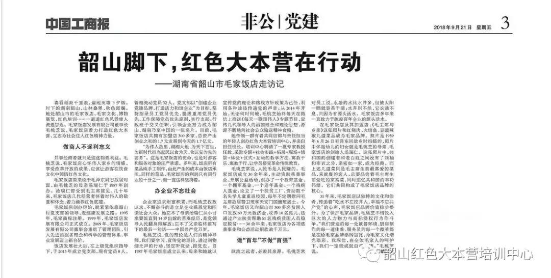 喜看稻菽千重浪,遍地英雄下夕煙。時下的湖南韶山,山林疊翠,秋色斑斕。地處韶山市的毛家飯店,毛家文化、博物展覽、紅色培訓(xùn)……一道道紅色風(fēng)景使人流連忘返。湖南韶山毛家飯店發(fā)展有限公司董事長、韶山紅色大本營培訓(xùn)中心校長毛桃芝說,毛家飯店著力打造紅色大本營,立志為社會注入紅色精神力量。