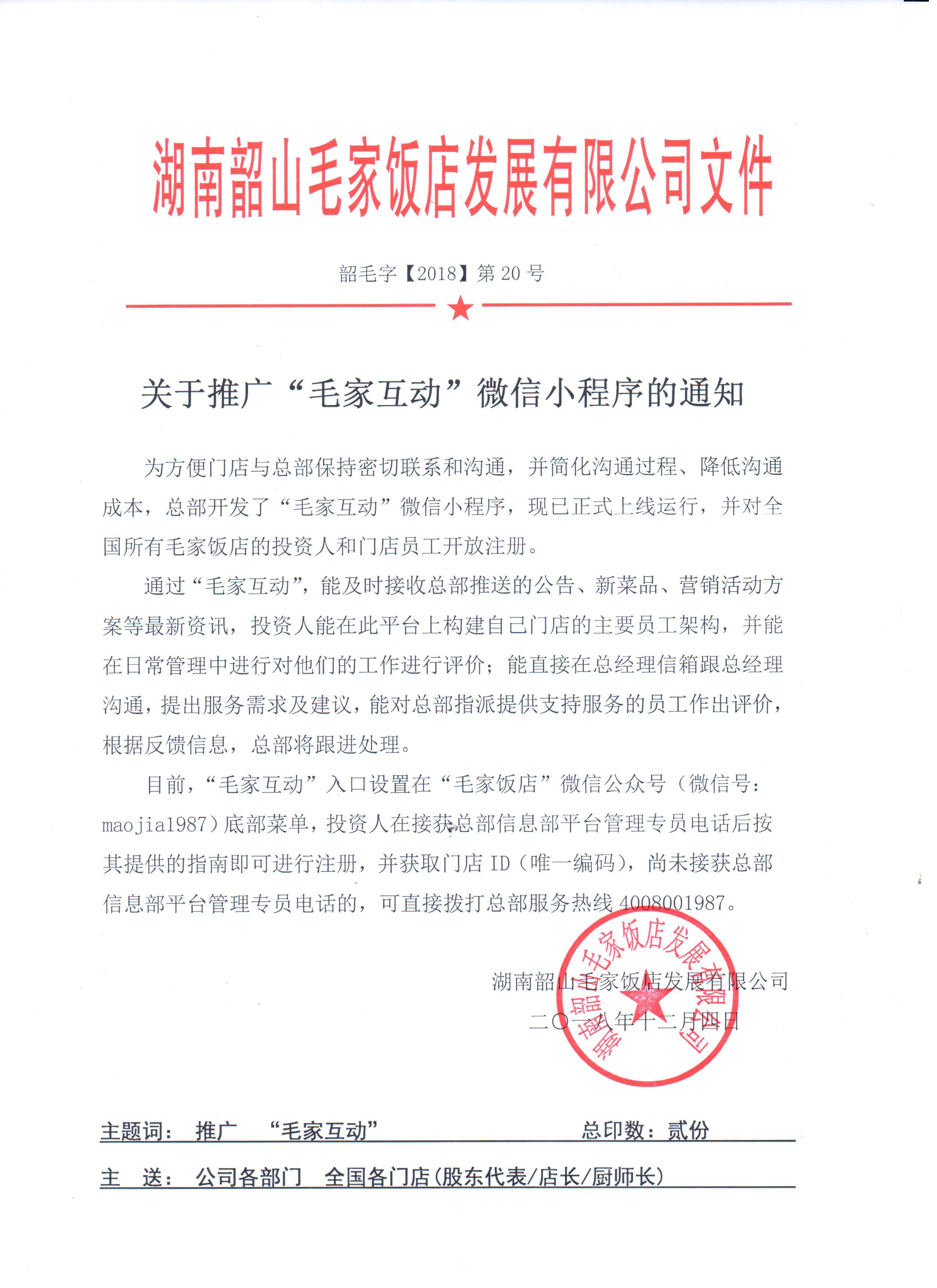 關于推廣“毛家互動”微信小程序的通知