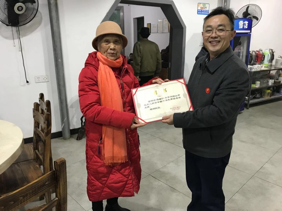 12月5日韶山市殘聯(lián)理事長(zhǎng)將聘請(qǐng)證書(shū)送到“湯媽媽”手中,她非常開(kāi)心,表示愿意為殘疾人事業(yè)盡心竭力。