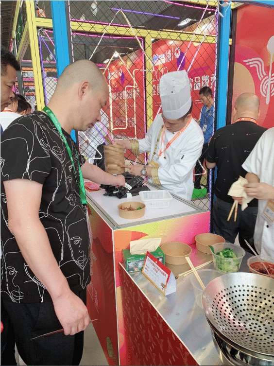 毛家飯店經(jīng)典招牌菜——毛家紅燒肉在長沙國際會展中心E2場館的餐飲品牌菜品展示區(qū)進行了展示,色澤紅亮的毛家紅燒肉盛放在定制的雙龍燉盅里,依然是亮眼的存在。在品牌秀上,毛家飯店代表方現(xiàn)場烹飪了毛家紅燒肉,并且提供30份給現(xiàn)場的觀眾進行品鑒。菜品烹飪完成后,30份很快就被現(xiàn)場觀眾領(lǐng)完了,并且得到了一致好評,毛家紅燒肉的美味還是那么容易“俘獲人心”。