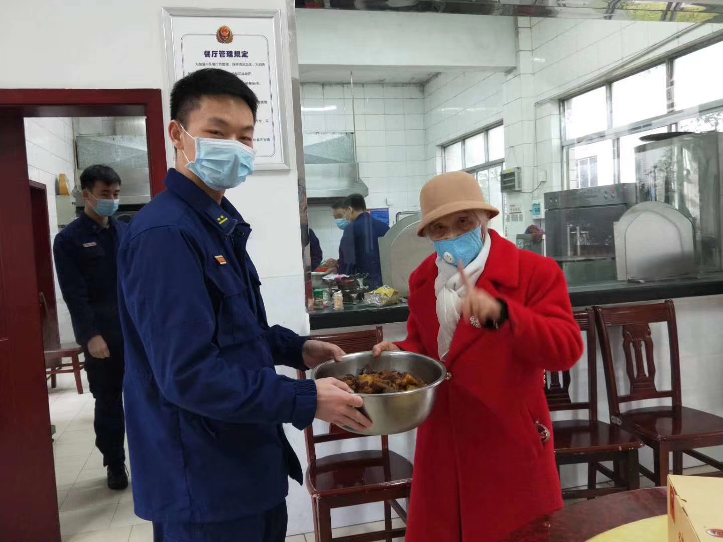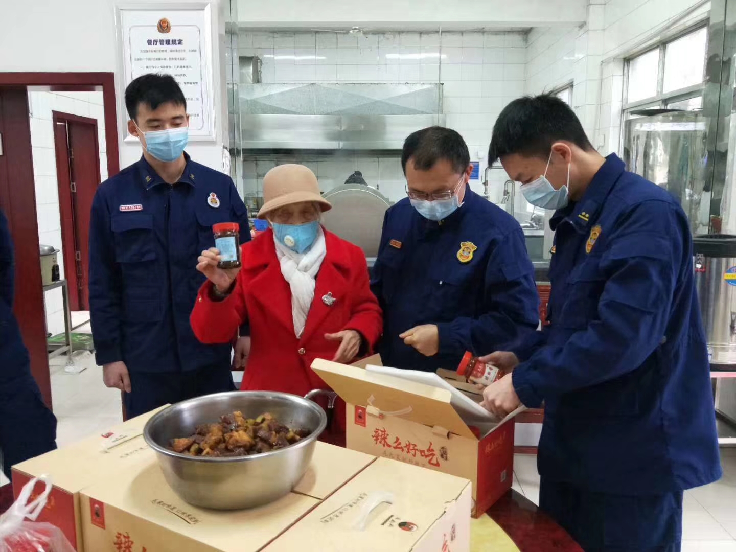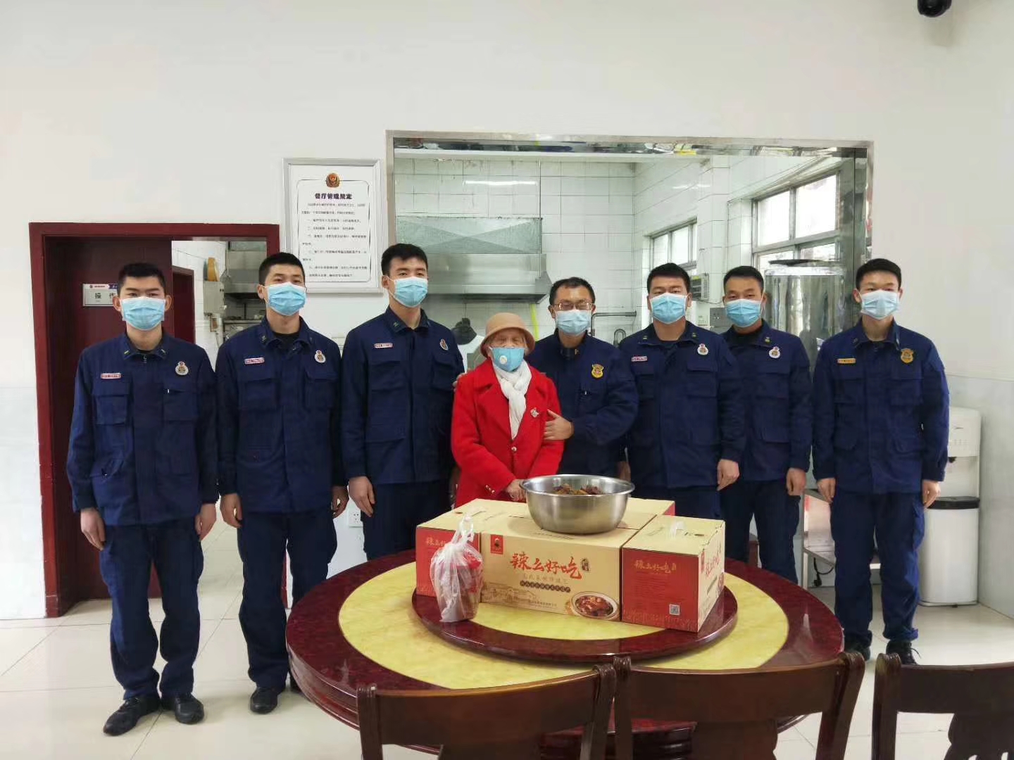 3月3日,得知大隊指戰(zhàn)員全員在崗忙于抗“疫”,沒有一人休息時,今年已經90歲高齡的全國愛國擁軍模范、第三屆全國119消防獎先進個人湯瑞仁奶奶一大早起床,親自掌勺、精心烹飪了一大鍋毛家紅燒肉,并在員工的陪同下將香噴噴、熱騰騰的紅燒肉及毛家食品送到了消防大隊。