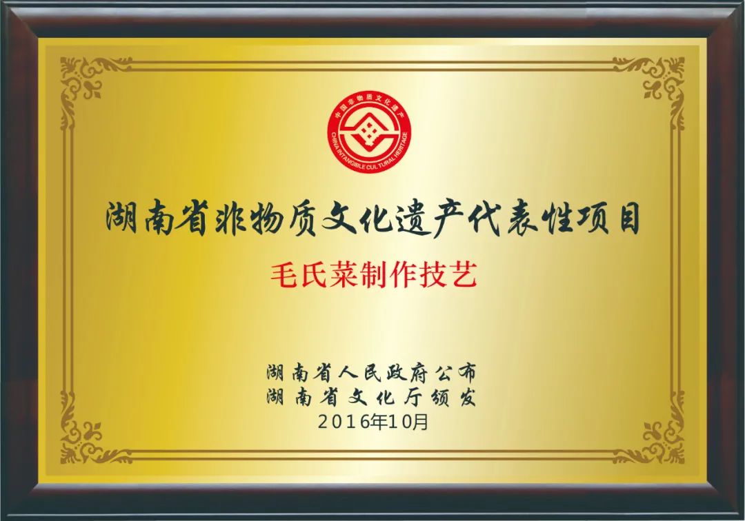 由于自身獨(dú)特的制作工藝與歷史寓意,『毛家飯店』的“毛氏菜制作技藝”已于2016年被列為湖南省非物質(zhì)文化遺產(chǎn)代表性項(xiàng)目,作為一種美食文化予以留存和保護(hù)。
