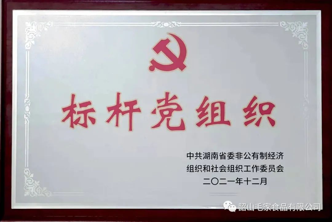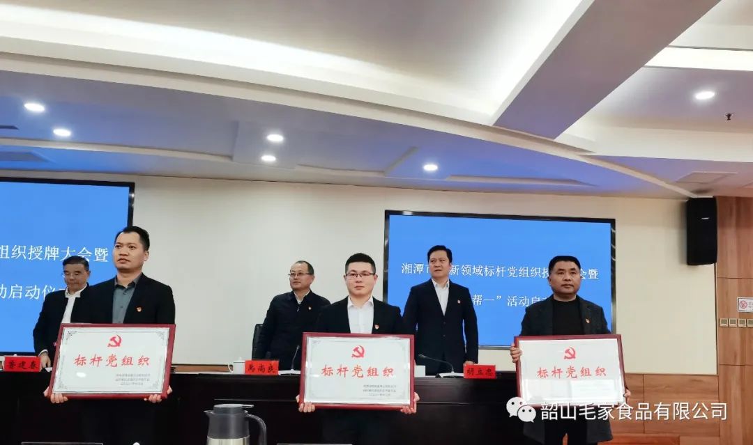 12月23日,湘潭市兩新領(lǐng)域標(biāo)桿黨組織授牌大會(huì)暨“黨建一幫一”活動(dòng)在湘潭市政府大樓舉行,對(duì)獲得省市縣“標(biāo)桿黨組織”進(jìn)行集中表彰授牌。韶山毛家食品有限公司黨支部獲評(píng)湖南省“標(biāo)桿黨組織”榮譽(yù)稱號(hào),也是韶山市唯一榮獲該榮譽(yù)的兩新組織。
