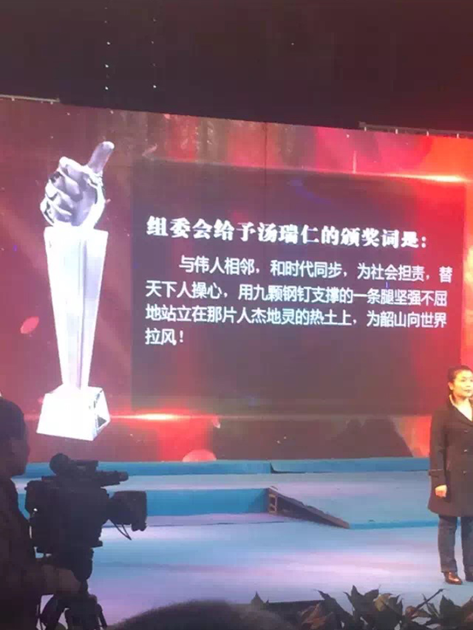 毛家飯店創(chuàng)始人湯瑞仁女士榮獲“湘潭市最美殘疾人”。組委會給予湯奶奶的頒獎詞是“與偉人相鄰,和時代同步,為社會擔責,替天下人操心,用九顆鋼釘支撐的一條腿堅強不屈地站立在那片人杰地靈的熱土上,為韶山向世界拉風!”