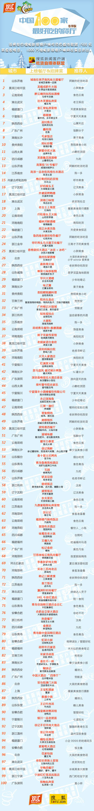 本次榜單評選自10月11日起,收到上百名美食家的積極推薦,上千家餐廳參與了本次活動的評選,所有餐廳獲得近1000萬份投票。評選出100家餐廳可謂是各個在宣傳中下足了功夫,被上萬粉絲力挺才殺出重圍的。本次殺出重圍的餐廳覆蓋全國22個省33個城市,共有57名美食家所推薦的餐廳進入到了榜單中。