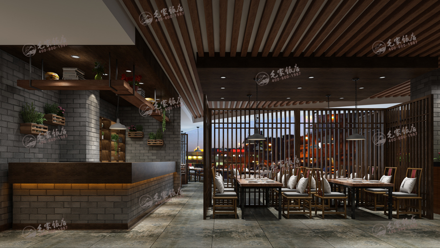 傳統(tǒng)質樸是毛家飯店新概念版的中心思路,在這個基礎上,采用大面積的紅磚來突出質樸的環(huán)境氛圍,以點成面,給人一種傳統(tǒng)質樸的感覺,并用木材來柔化紅磚硬朗的感覺,點綴上綠植,讓人回憶起熟悉的場景。
