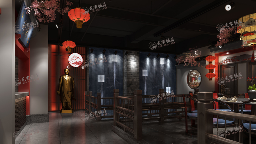 在新青年版本的基礎上,繼續(xù)升級而來,打造更符合現(xiàn)代的時尚版本,用現(xiàn)代時尚的建筑元素和裝飾元素替代復雜的傳統(tǒng)元素,更加突出毛家的紅色主題和文化,給顧客耳目一新的感覺,讓場景更加時尚,符合新時代的裝飾風格和效果。