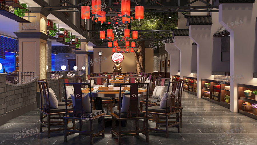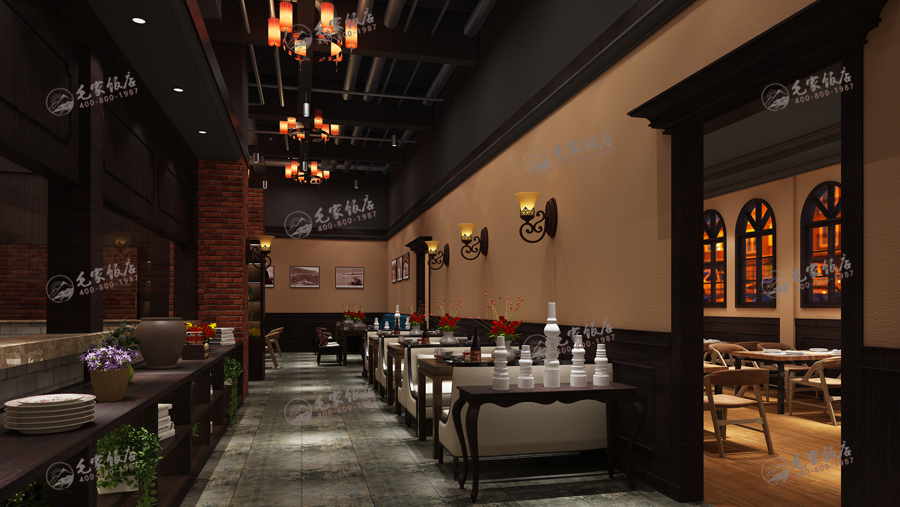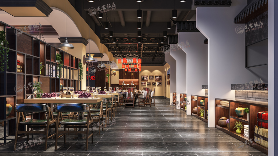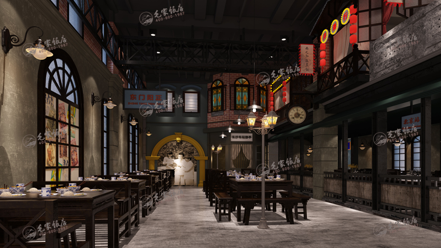 民國版是最近兩年流行的設計版本,整體環(huán)境偏暗目的是營造相對舒適輕松的就餐環(huán)境,借鑒傳統(tǒng)的中式民居特點的基礎上,保留傳統(tǒng)中式民居和街道特征,并融入現(xiàn)代裝飾風格和元素打造的風格元素,目的營造一種解放前的懷舊氛圍。